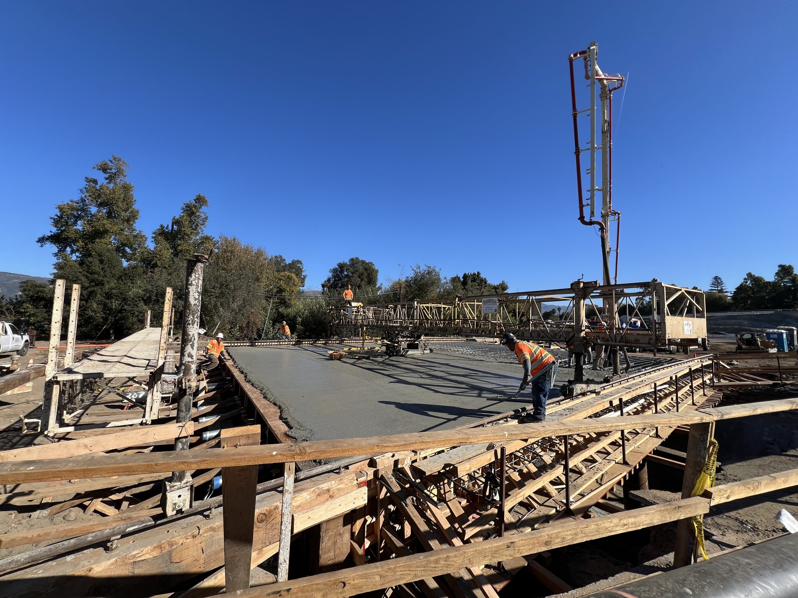Construction activities for Project Connect are advancing smoothly along Hollister Avenue, with significant progress made on the north side of the Hollister Avenue Bridge over San Jose Creek. In an impressive feat, crews completed a large concrete pour, with 35 trucks delivering 320 cubic yards of concrete in just one day. This concrete was pumped into the newly constructed rebar decking.