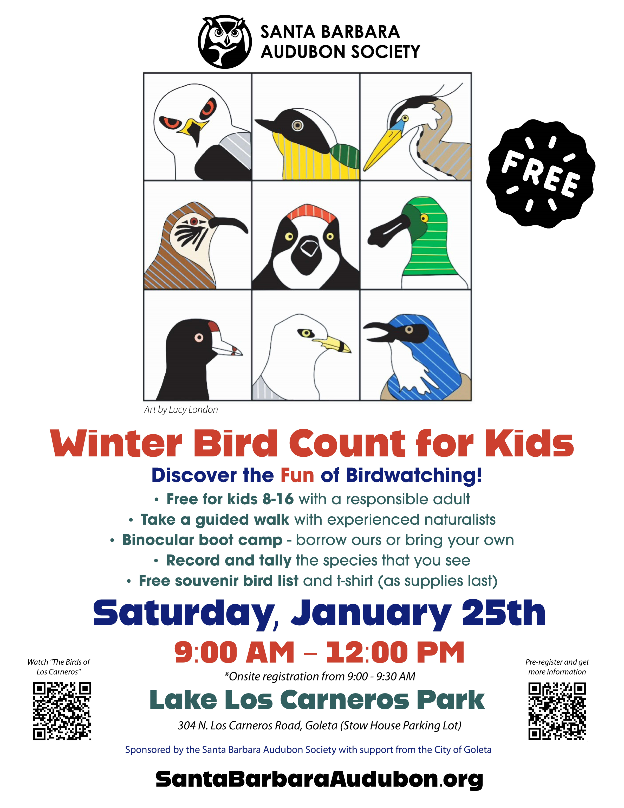 The Santa Barbara Audubon Society (SBAS) presents, with the support of the City of Goleta, a free educational event for the children in our community: the 11th Annual Winter Bird Count for Kids to be held on January 25th from 9:00 a.m. – 12:00 p.m. at Lake Los Carneros Park. Registration is from 9:00 to 9:30 a.m. on the grounds of Stow House (304 N. Los Carneros Road).