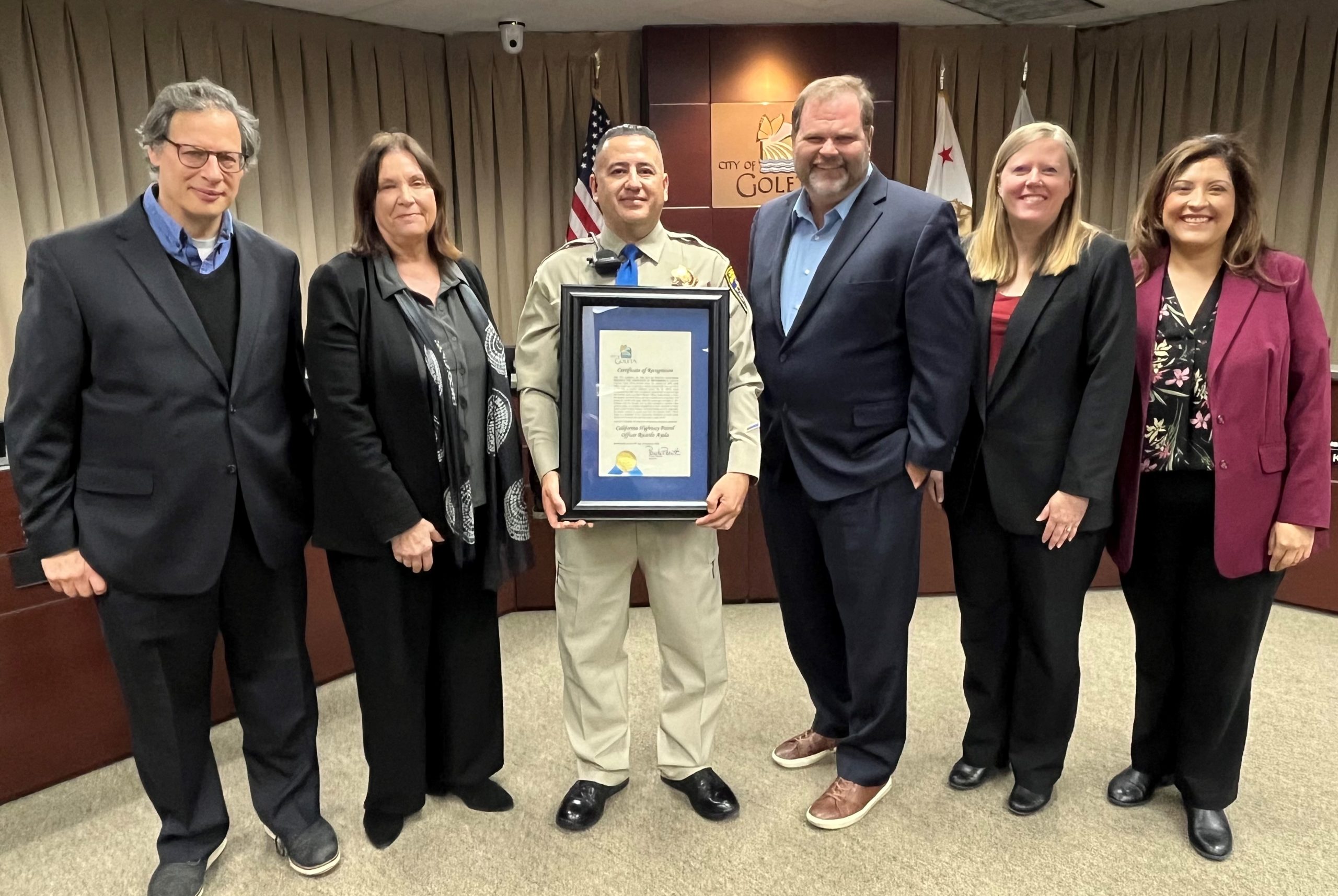 Officer Ayala with the Goleta City Council (pictured left-to-right): Mayor Pro Tempore Stuart Kasdin (District 4), Mayor Paula Perotte, Officer Ricardo Ayala, Councilmember James Kyriaco (District 2), Councilmember Jennifer Smith (District 3) and Councilmember Luz Reyes-Martín (District 1)