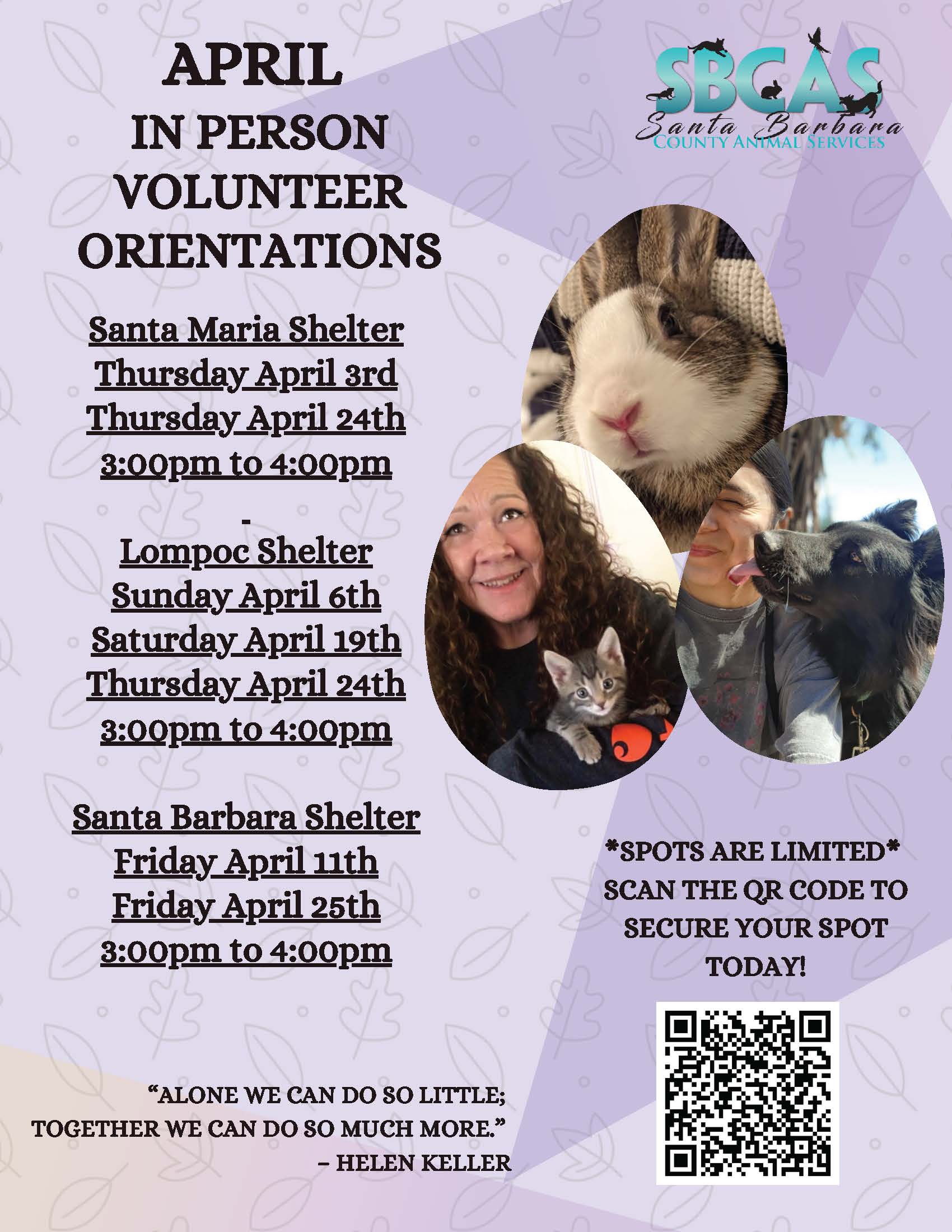 SBCAS April Volunteer Orientations 2025 Published April 1, 2025 at 1700 × 2200 in Volunteer with SB County Animal Services Image navigation