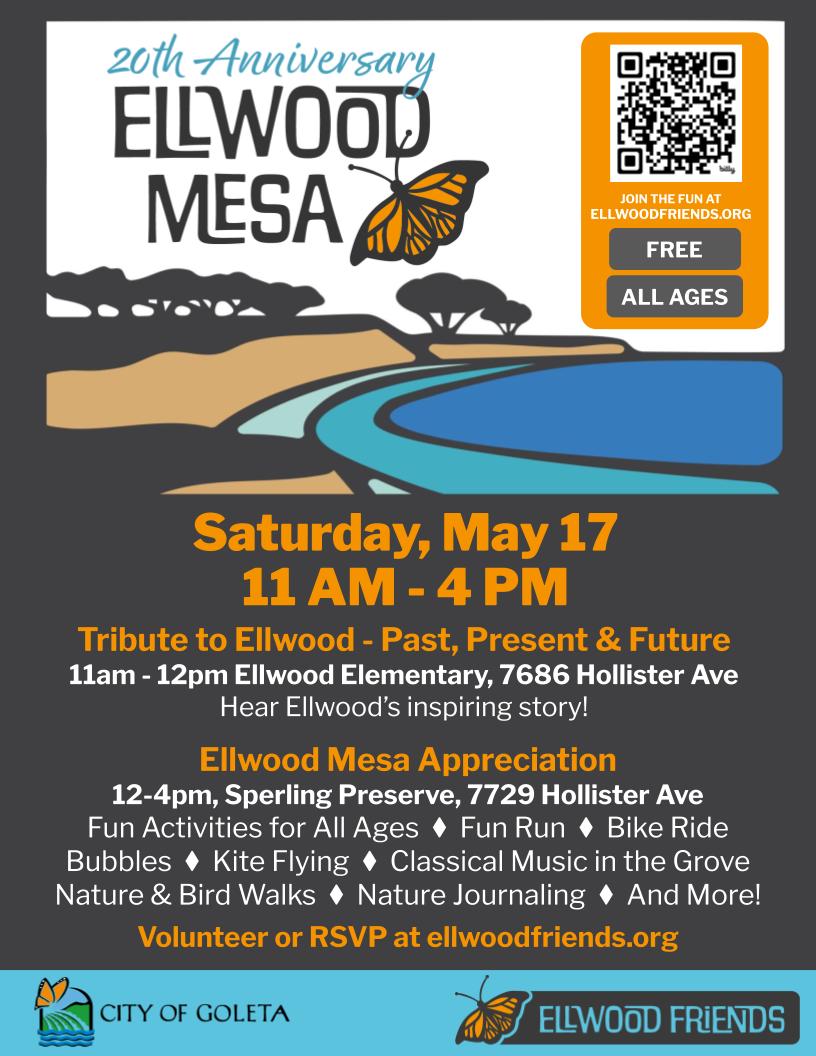 11 AM – 12 PM: Tribute to Ellwood – Past, Present and Future. Hear the inspiring story of Ellwood Mesa by those who helped protect this beautiful sanctuary from development. Tribute will be held at Ellwood Elementary, 7686 Hollister Avenue.