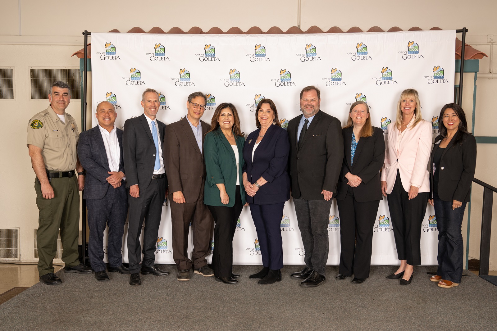 Group Photo (left-to-right): Goleta Chief of Police Lt. Frank Vasquez, 1st District County Supervisor Roy Lee, City Manager Robert Nisbet, Mayor Pro Tempore Stuart Kasdin (District 4), Councilmember Luz Reyes-Martín (District 1), Mayor Paula Perotte, Councilmember James Kyriaco (District 2), Councilmember Jennifer Smith (District 3), Chair of the Board and 2nd District Supervisor Laura Capps and Santa Barbara County Superintendent of Schools Dr. Susan Salcido