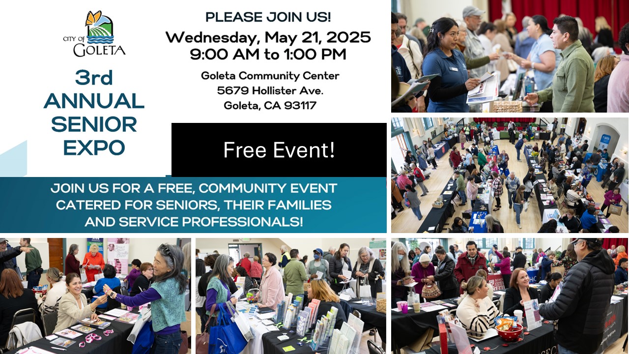Attention all Seniors and caregivers, the City of Goleta is pleased to once again hold a free Senior Expo on Wednesday, May 21st from 9:00 a.m. – 1:00 p.m. at the Goleta Community Center (5679 Hollister Avenue). This information packed event is designed to empower seniors, their families and service professionals with valuable resources and information.