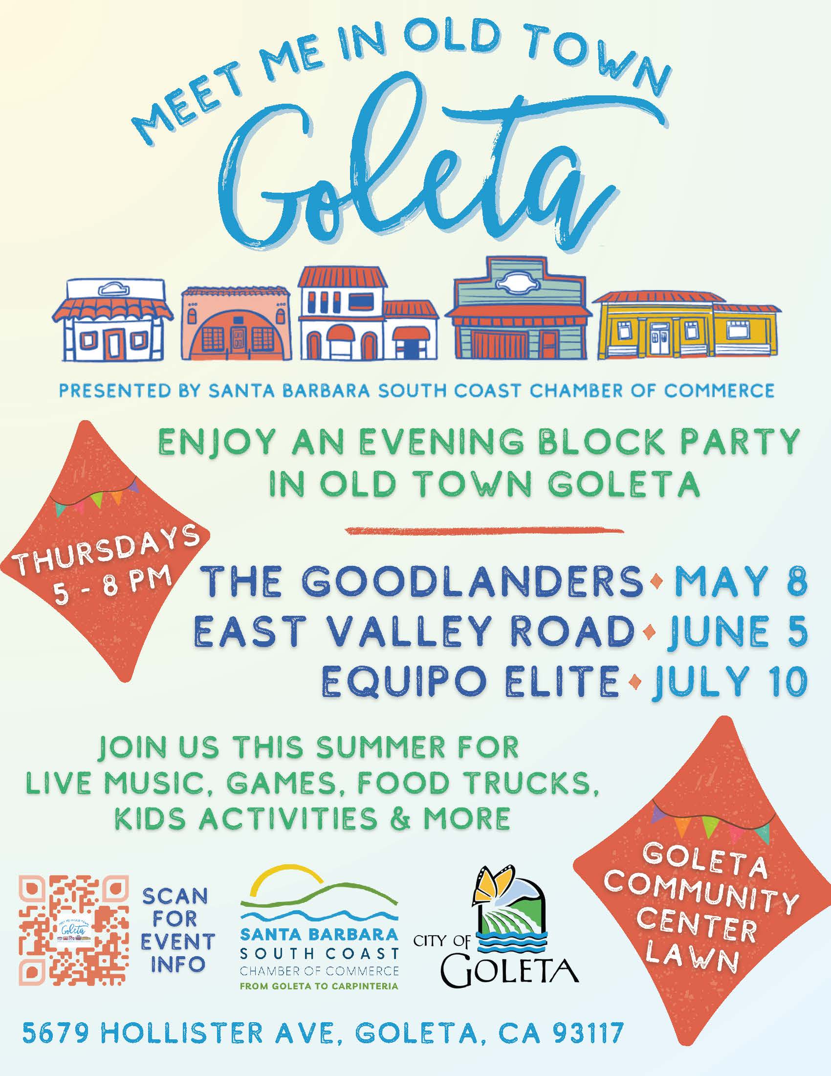 The Santa Barbara South Coast Chamber of Commerce, in partnership with the City of Goleta, is thrilled for the return of the “Meet Me in Old Town Goleta” block party series. Now in its second year, this free community event is moving to a larger, more accommodating location to welcome even more neighbors, friends, and families.