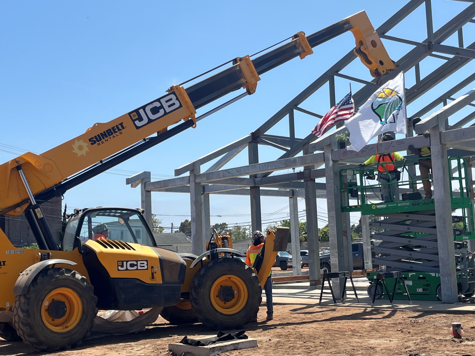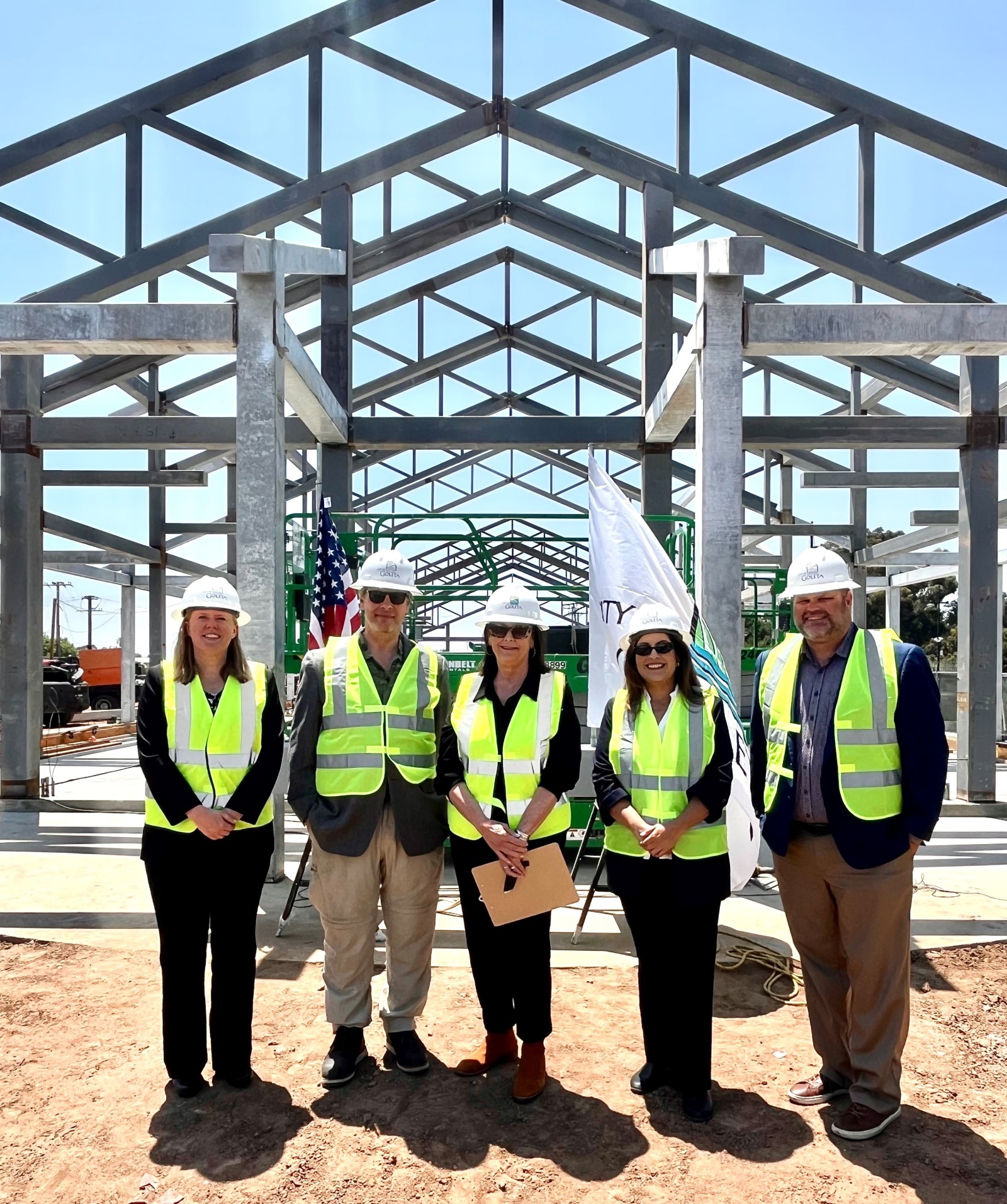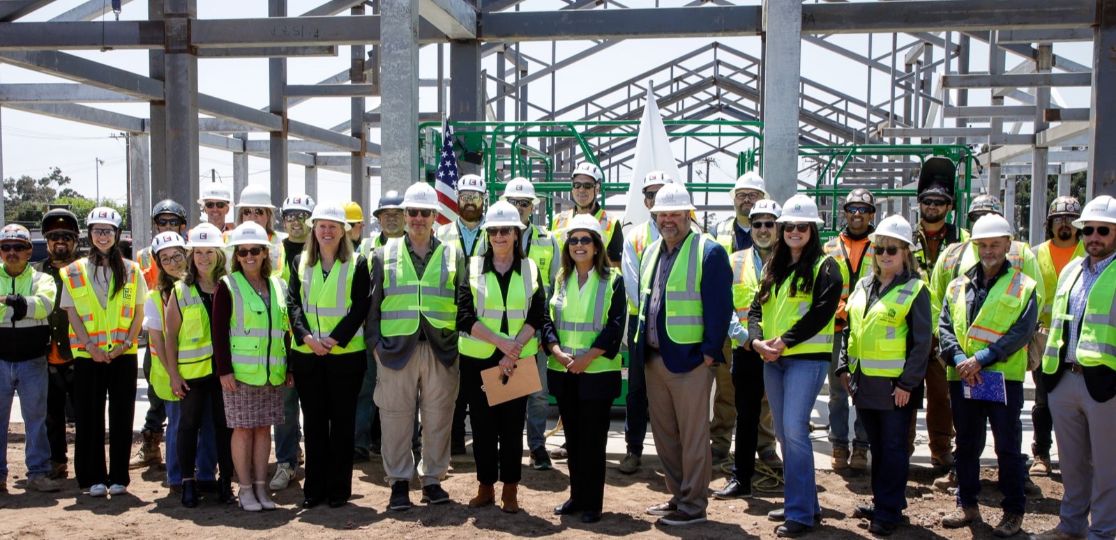 The topping off ceremony, a tradition in the construction industry, celebrates the safe, successful completion of the installation of structural steel framing and recognizes the accomplishments of the construction crew. The final beam was signed by workers and project partners adorned with symbolic elements like an evergreen tree for growth and good fortune, and both an American and a City of Goleta flag connecting the building to its community and identity. The beam was hoisted into place followed by applause from the audience. Due to the active construction site, attendance was limited.
