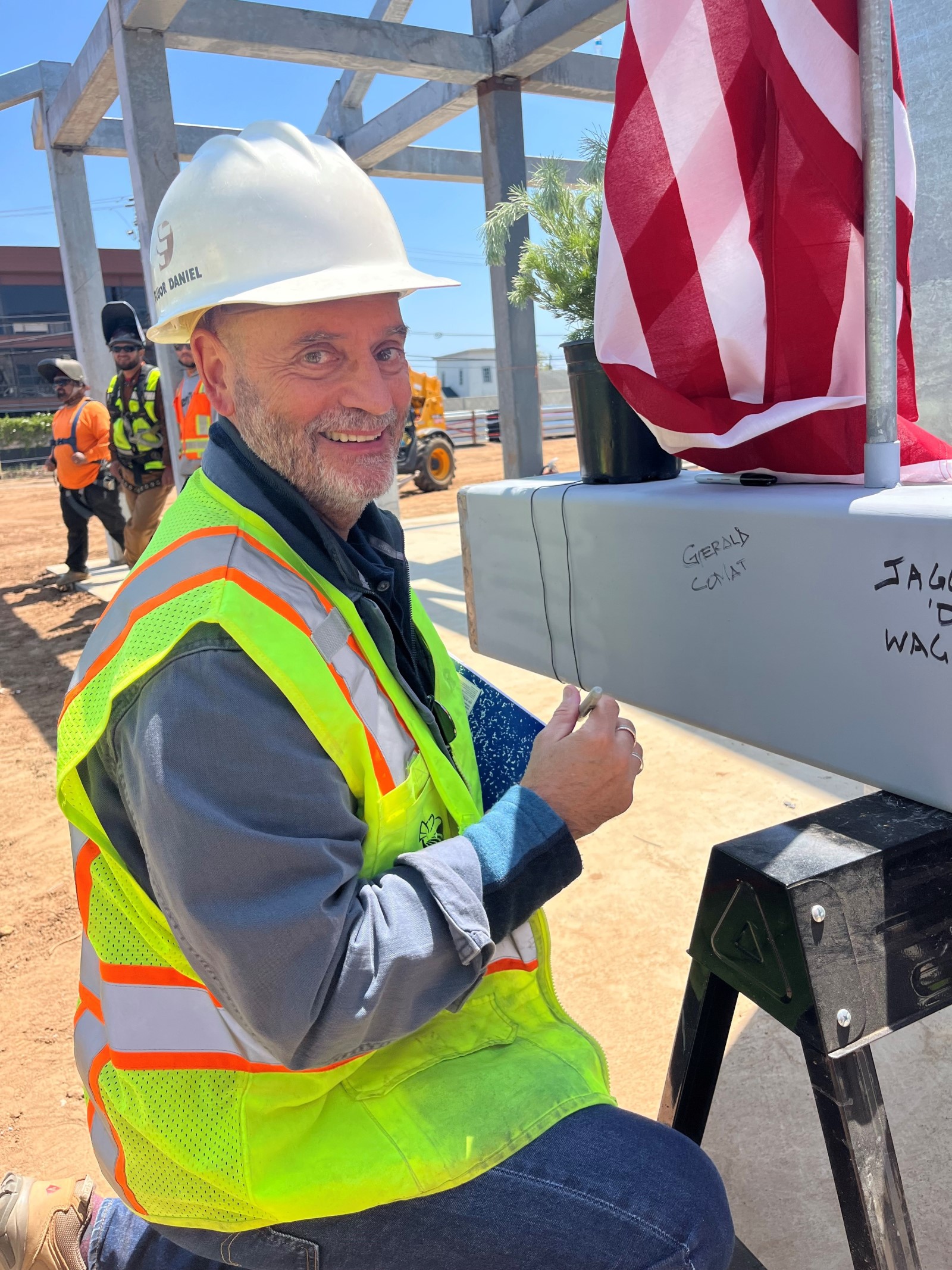 City consultant Gerald Comati signs the final steel beam before it is placed