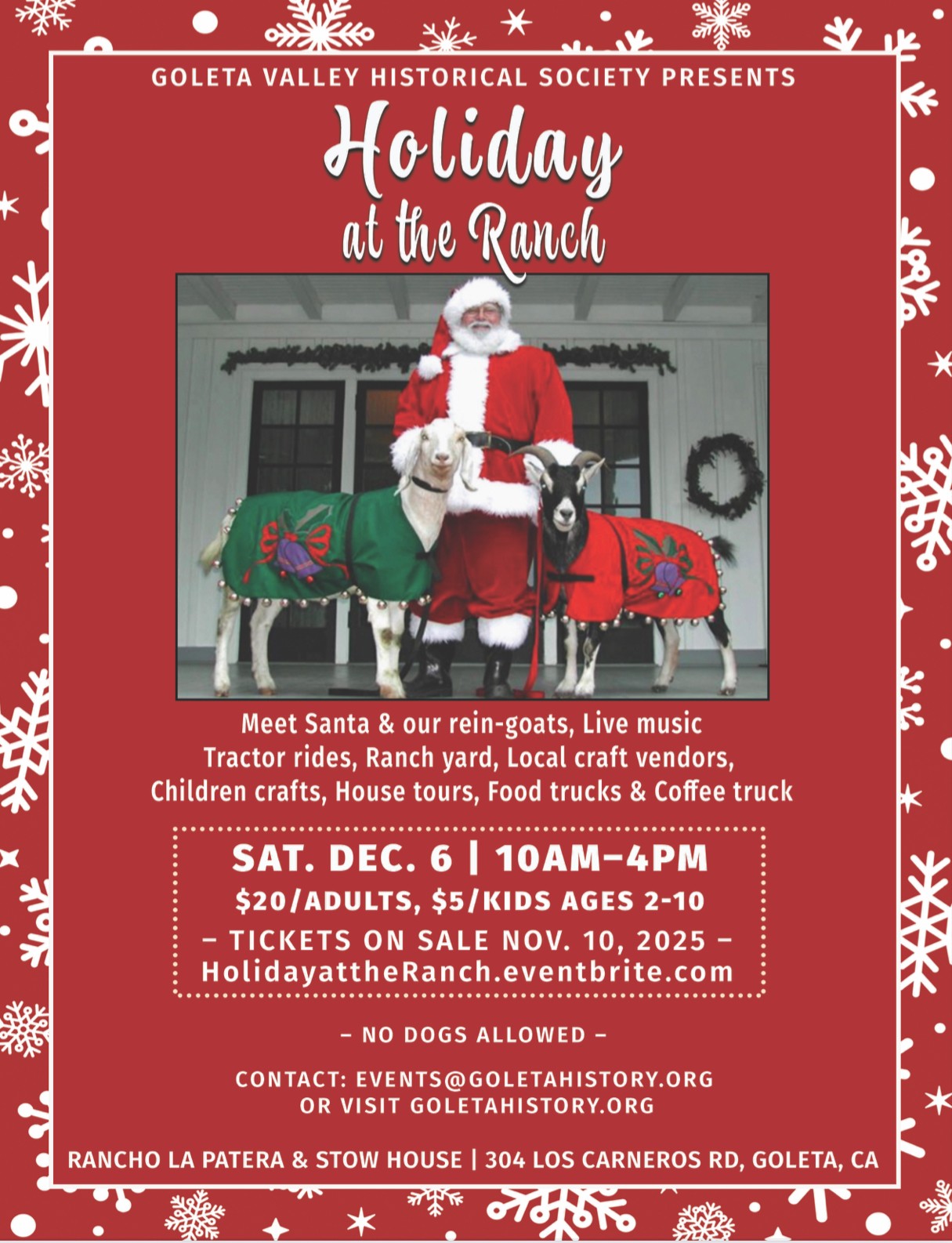 Save-the-date for the Goleta Valley Historical Society’s cherished Holiday at the Ranch on Saturday, December 6! Head over to the Stow House (304 N. Los Carneros Rd) from 10:00 a.m. – 4:00 p.m. to meet Santa and the rein-goats, enjoy live seasonal music, make children’s crafts, check out local vendors, and tour the decorated Stow House. Tractor rides will be available as well as food trucks on site. Tickets go on sale November 10 (Children $10/Adults $20) and you can schedule your time to meet Santa. Go to https://goletahistory.org/holiday-at-the-ranch/ for more info.