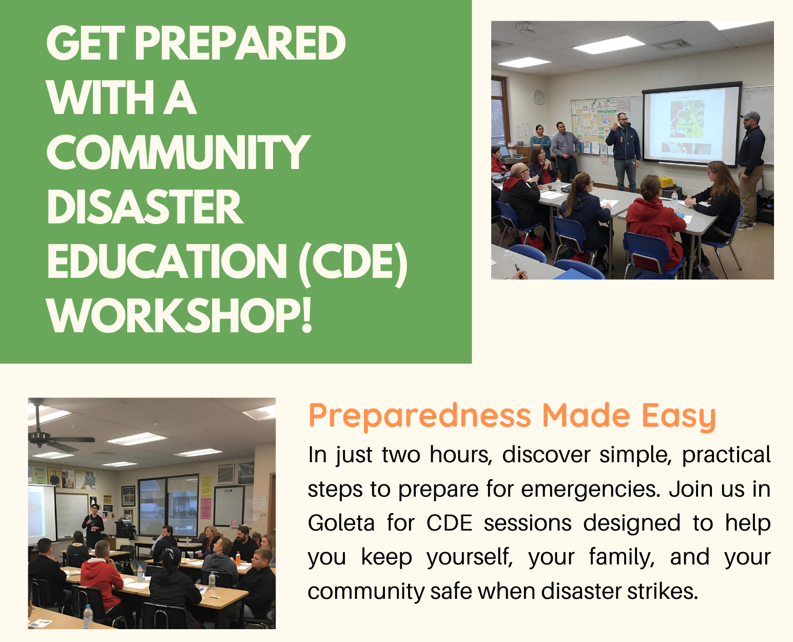 The City of Goleta’s Emergency Services Division invites community members to join our upcoming Community Disaster Education (CDE) class on Tuesday, November 18, from 6:00 to 8:00 p.m. at the Goleta Community Center (5679 Hollister Avenue).
