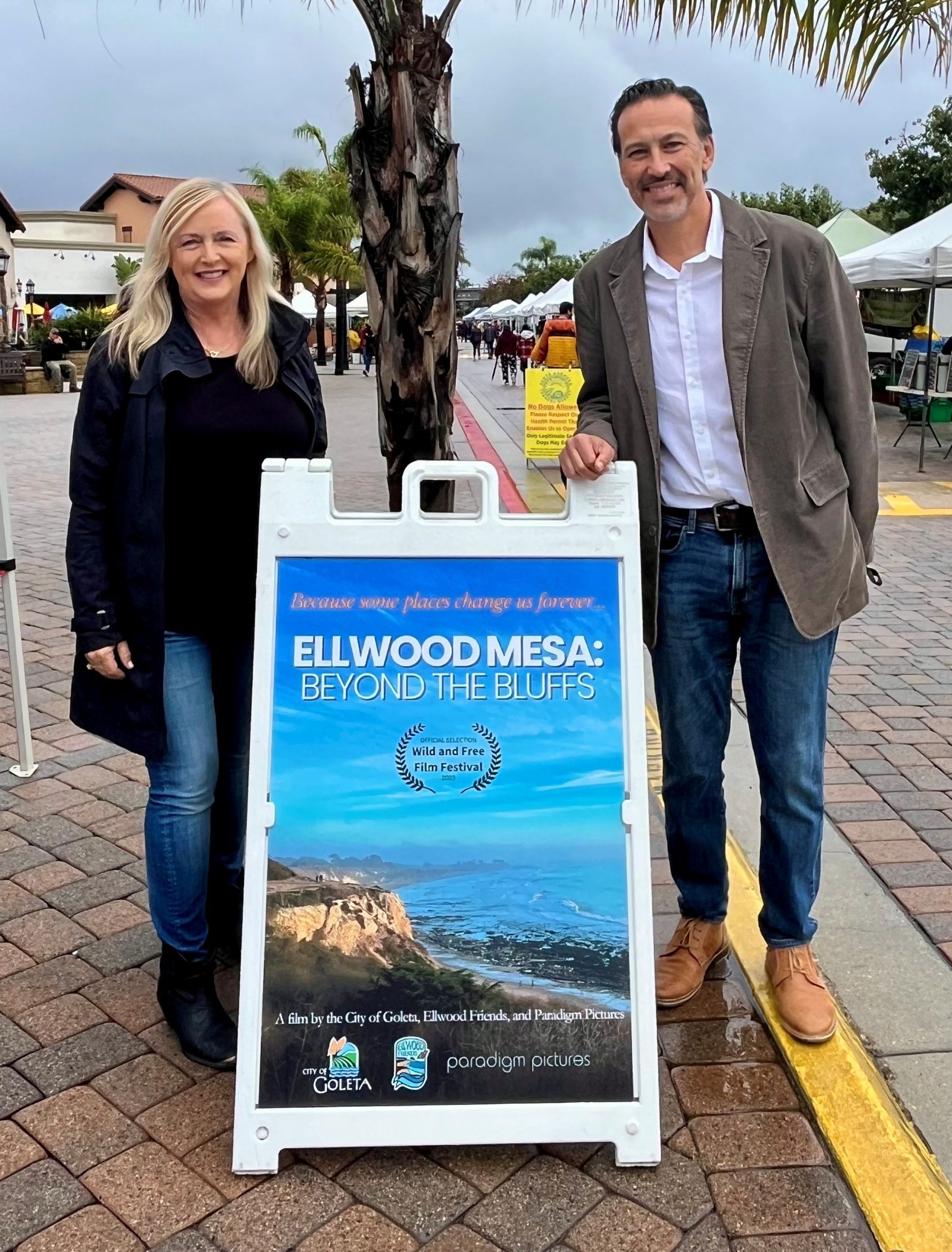 Community Relations Manager Kelly Hoover (left) and filmmaker Paul Westmacott of Paradigm Pictures (right) posing with “Ellwood Mesa: Beyond the Bluffs” movie poster at Camino Real Cinemas before the Wild and Free Film Festival premiere