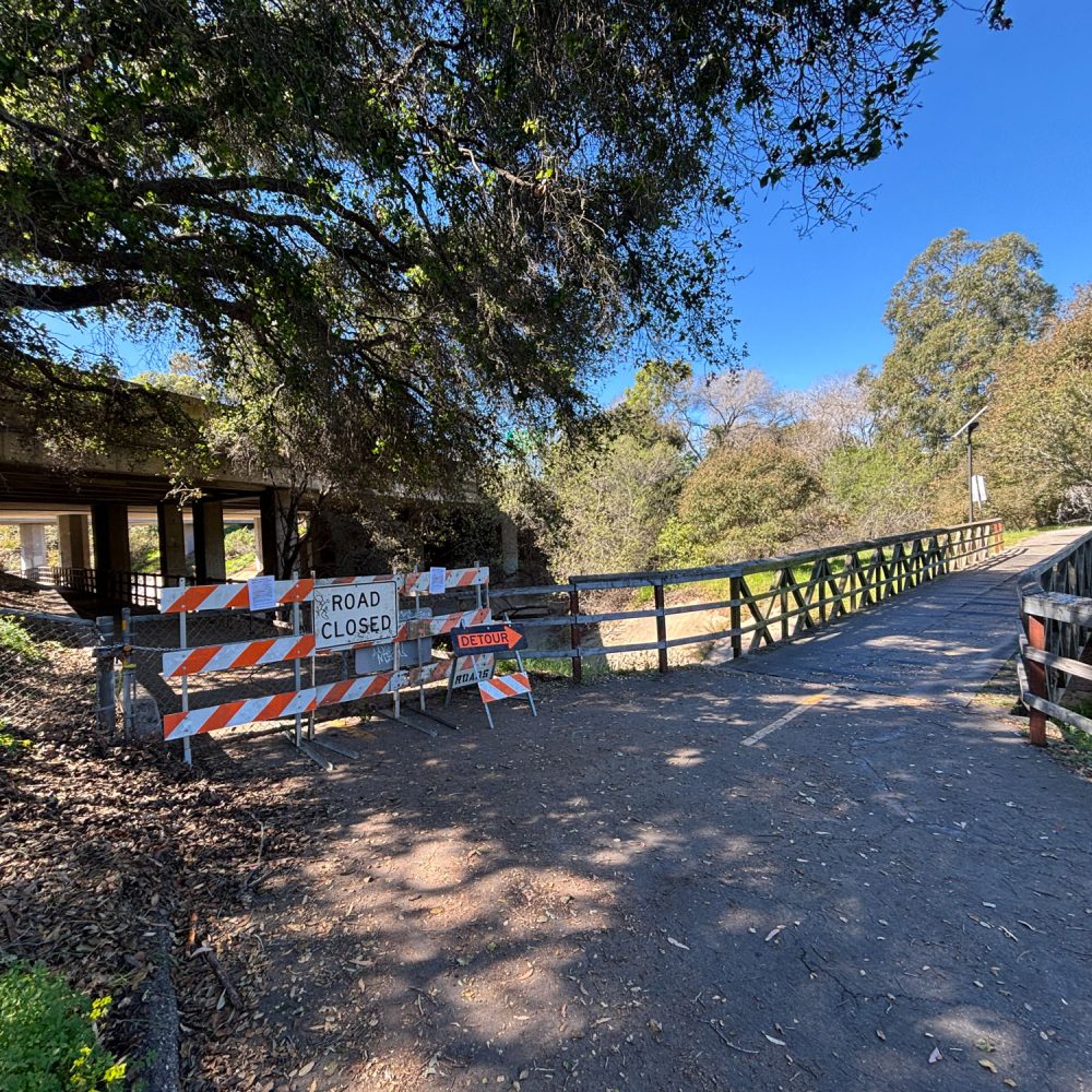 While the Maria Ygnacio Bike Path is critical to residents, students, and those who commute via active modes of transportation, travelers should not evade path closure signs in this area. The situation is dynamic and the undermining of the path increases as the high flowing creek below is actively scouring dirt below the structure. Travelers should use Turnpike Avenue or Patterson Avenue to connect with the bike path.