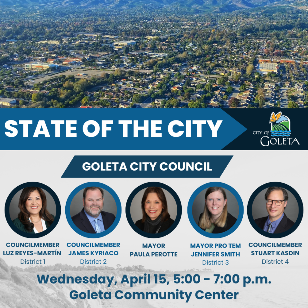 Mark your calendar for the City’s biggest night of the year! The Goleta Community State of the City is taking place on Wednesday, April 15 from 5:00 – 7:00 p.m. at the Goleta Community Center (5679 Hollister Avenue). This event, in its ninth year, will have a new format. The Mayor and the entire City Council will be presenting on the City’s accomplishments and challenges. Simultaneous Spanish interpretation will be available and light refreshments provided.