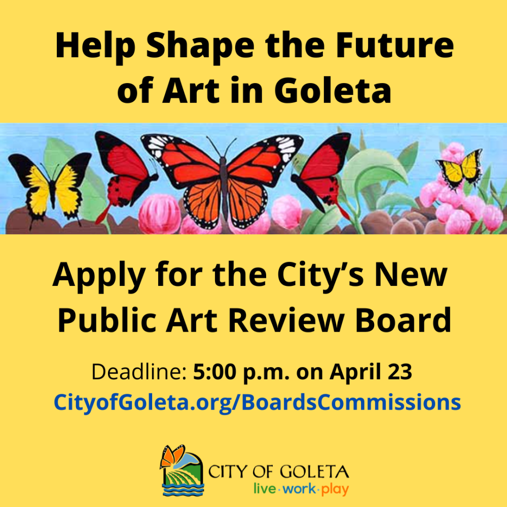 Apply today to help shape the future of public art in Goleta! The application can be found online at www.cityofgoleta.org/boardscommissions. Applications are due by April 23, 2026, at 5:00 p.m. For more information, please email cityclerkgroup@cityofgoleta.gov.