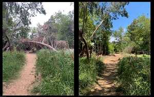 Pictured: Cleared trail leading west from the end of Coronado Drive (before and after photos)