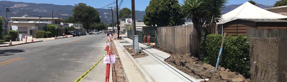 The City of Goleta is pleased to announce that construction on the sidewalk and parking project in Old Town Goleta is proceeding along successfully. The contractor is working on Phase 4 out of 5 phases. Utility work by Southern California Edison (SCE), Frontier Communications, Cox Communications, and Goleta Water District (GWD) will take place in August and will impact area residents. The work is needed to complete the project and the City’s construction management team, contractor, and utilities are working to minimize the impacts to the residents during construction. SCE and GWD will be providing notifications to the residents with the work details prior to starting their work.