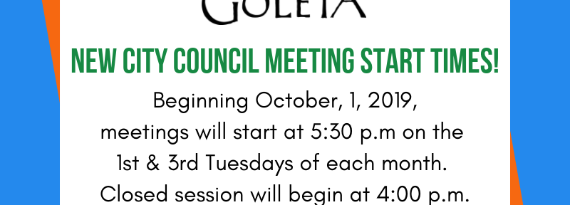 Beginning October 1, 2019, Goleta City Council meetings will start at 5:30 p.m., with closed session taking place at 4:00 p.m. It is hoped that later meeting times will allow more people to participate. Meetings will continue to be held on the first and third Tuesdays of each month. There are several ways to watch a meeting: